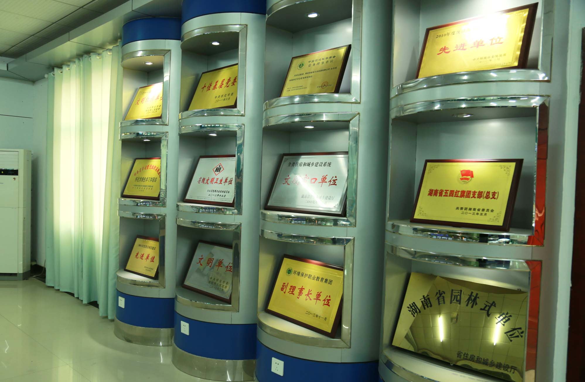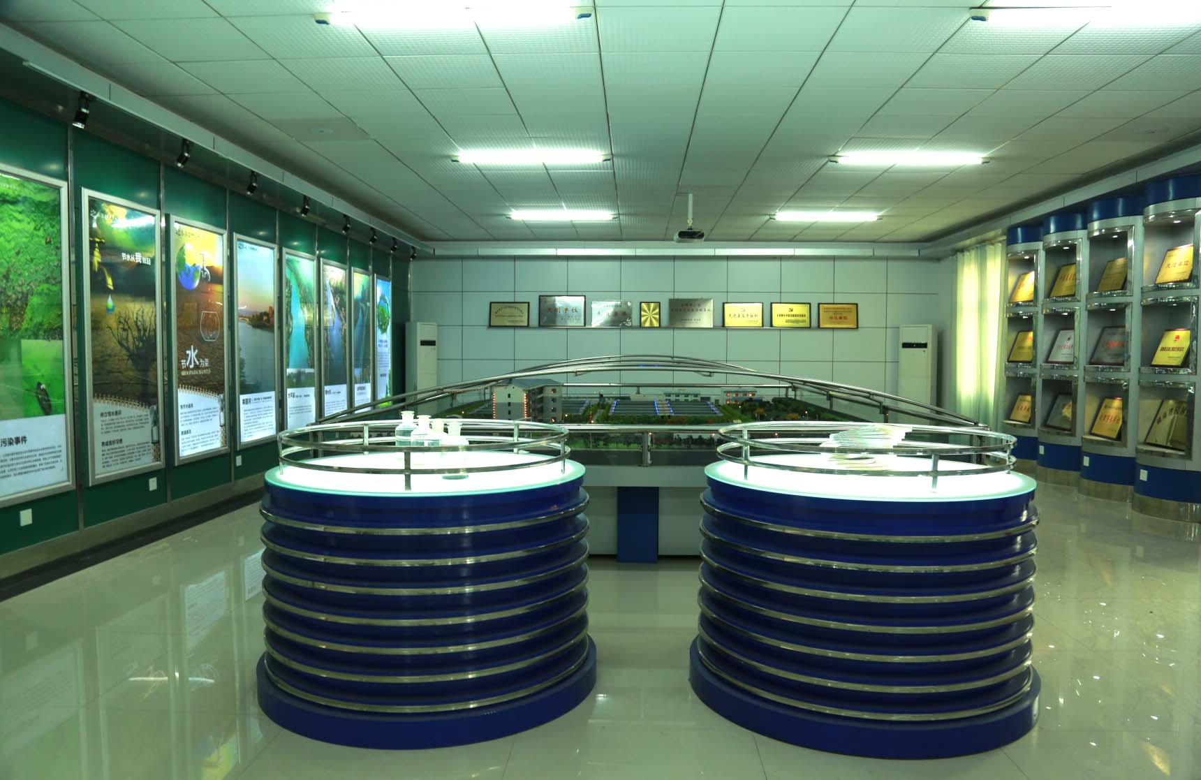 展览厅分为四个部分,一是水环境保护的宣传,二是平面布置实体模型,三是华体会电竞(科技)公司党委历年获得的部分荣誉展示,四是进出水样。
